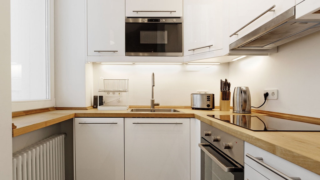 Brand new, bright and quiet 2-room apartment. Very well cut, spacious living room with balcony and view into the backyard. This modern luxury new apartment with high ceiling is located in a rebuilt historic building on a quiet street in the middle of the city. The one bedroom apartment is furnished in a modern style and offers a comfortable living space. From the living room you enter onto the balcony and bedroom. The apartment includes a newly installed modern white kitchen cabinet equipped with silver appliances and a wooden countertop.