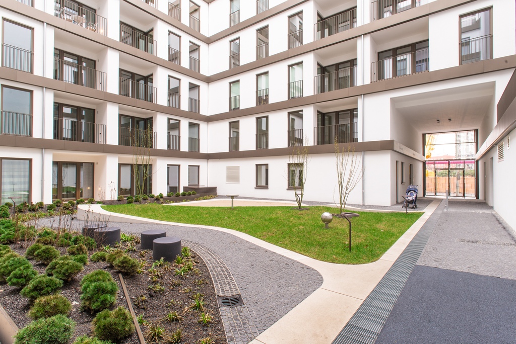 Bright, high-quality 2-room apartment in a new condo development, located in the very center of the city. The house was built in 2016. All apartments in the house are located into a quiet green backyard, protecting the house from the noise of the street. Very peaceful and quiet living, despite the very central location.
