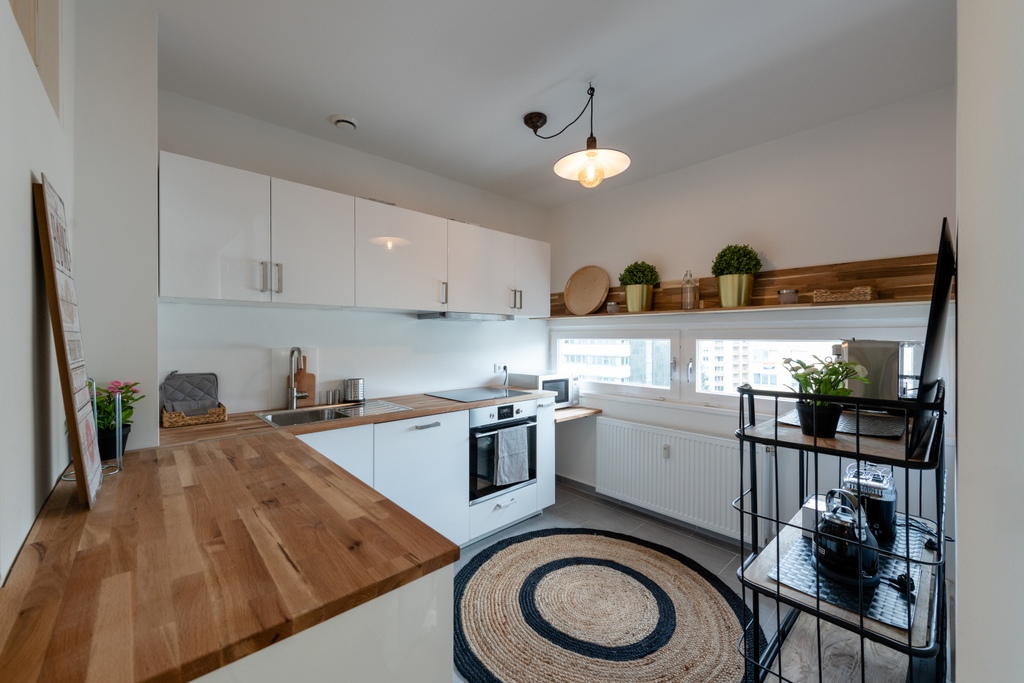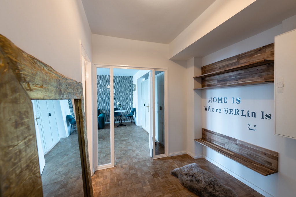 AREA: This district of the city, which is full of greenery, offers excellent infrastructure, quiet living and international flair. This fully furnished two-room apartment is located on Bundesallee. The transport connections are optimal: The apartment is 300 meters away from the Berliner Straße underground station. In addition, an on-ramp to the A100 city motorway is also located in the immediate vicinity. An array of shops to satisfy daily needs, from bakery to hairdresser, are located in the neighborhood along with supermarkets and branches of banks, savings banks and credit unions. There is even a petrol station and a car repair shop just around the corner. Sports enthusiasts will be pleased to find a McFIT gym right across the street as well as Schoelerpark, which features sports fields for football, volleyball and basketball, within walking distance. In addition to Schoelerpark, Volkspark Schöneberg-Wilmersdorf and Preußenpark with Germany’s largest Asian street food market are a 15-minute walk away.