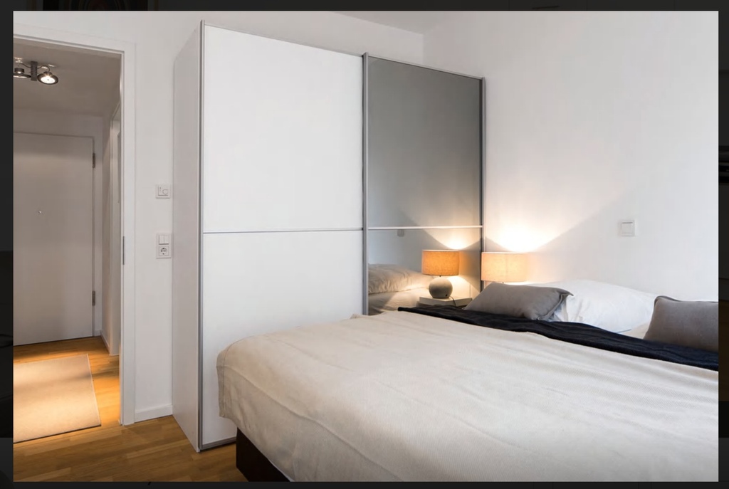 Hotel style 2-room apartment with an open space reception room incl. kitchen. The apartment is very bright and quiet despite the central location facing the street. Triple glazed windows, air-conditioning, underfloor heating. Super comfortable boxspring bed in the bedroom. Dryer and washing machine in the bathroom. The kitchen is equipped with all necessary utensils.