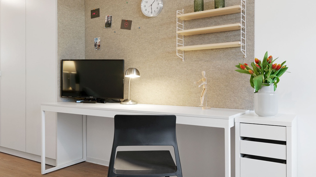 Clarity, functionality and optimum use of space are the outstanding characteristics of the studio apartments. Plenty of storage options, an open kitchen and customized furniture give residents plenty of room for maneuver. The large felt pin board not only offers room for photos and notes, it also lends the apartments flexibility for creative flair and the individual touch.