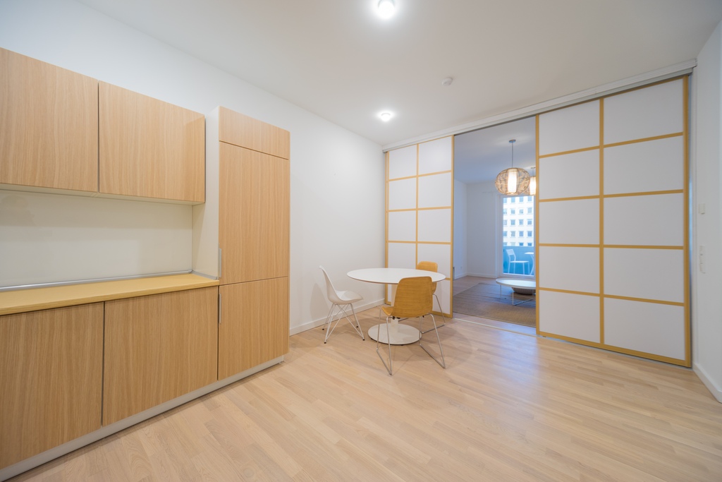 Bright, high-quality 3-room apartment in a new condo development, located in the very centre of the city. The house was built in 2015. All apartments in the house are located into a quiet green backyard, protecting the house from the noise of the street. Very peaceful and quiet living, despite the very central location. The condo includes an indoor private gym for all tenants and a communal rooftop terrace with a stunning view over the city.